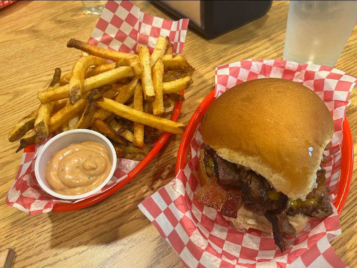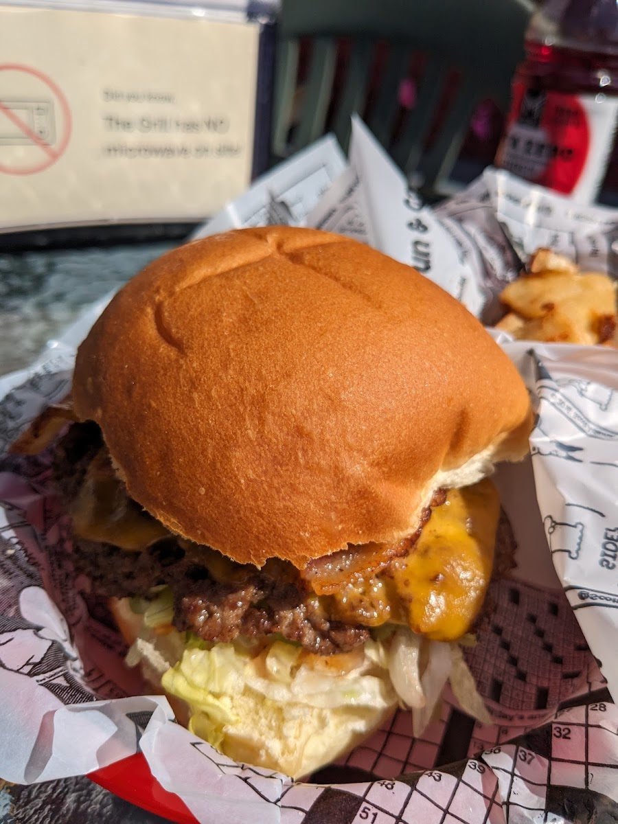 The food was amazing!! Top 3 burger ever for me. I got the jalapeño popper burger with fries and cheese curds. My dad got a regular bacon cheeseburger. Bun was amazing. Patty was nice and crisp. Amazing food